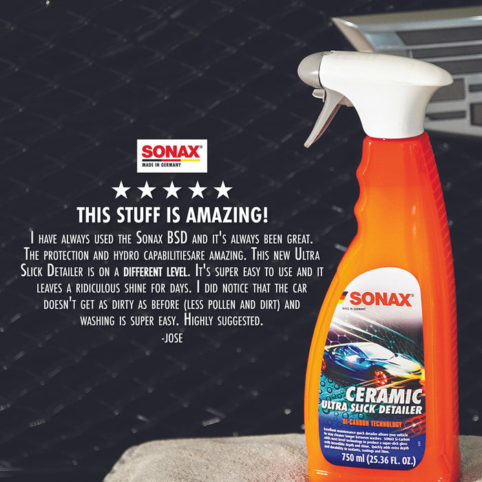 Best of all, SONAX Ceramic Ultra Slick Detailer coming in the ease of spray. With this product, you get the complexities of a ceramic product, without having to take the time to thoroughly apply. All you have to do is spray and wipe away! Save time, money with SONAX Ceramic Ultra Slick Detailer.