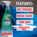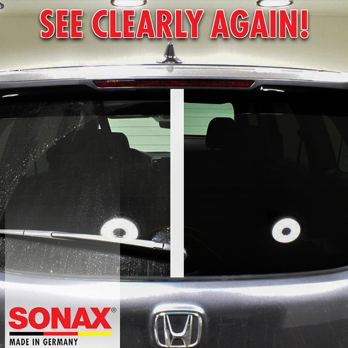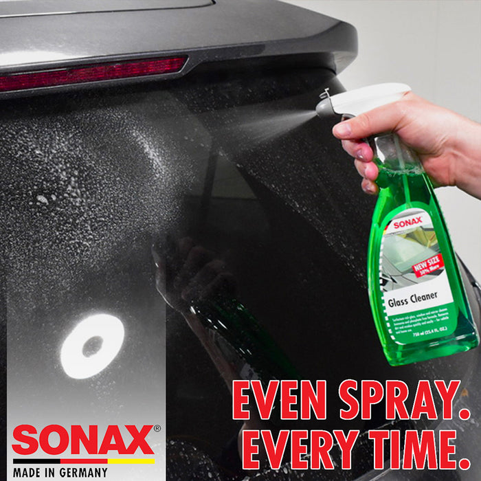 SONAX Glass Cleaner eradicates exhaust film, nicotine film, insects, and dirt from windshields and windows. This phosphate-free formula leaves a streak-free shine for optimum visibility. Use SONAX Glass Cleaner on household glass, too. Your vehicle is constantly exposed to dirt, car exhaust, and bugs. These contaminants can stick to glass and cloud your visibility, creating unsafe driving conditions and for you, your passengers, and other motorists. Dirty auto glass is especially dangerous when it rains because the oily residue on the glass blends with water to make a blurry mess.