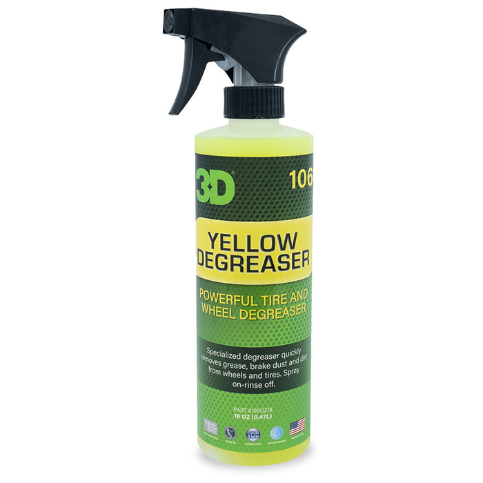 3D Yellow Degreaser is a powerful but also very safe cleaner and degreaser for all wheels, tires, and the wheel well area. Non-toxic and acid-free, this degreaser can be safely used to clean any surface in the wheel area. Dissolves and breaks the bond between oily brake dust and your car’s rims. Excels at the more difficult cleaning jobs including removing older, previously applied greasy, silicone-based tire dressings.