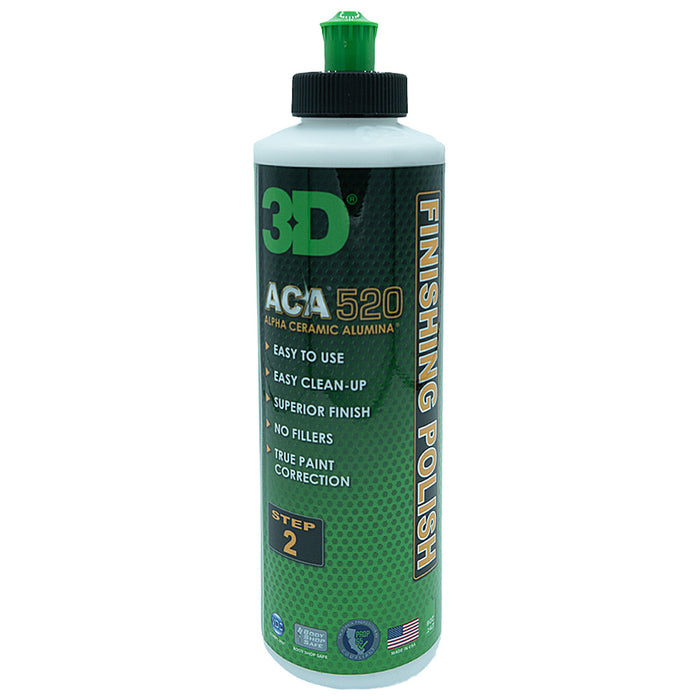 3D's ACA Finishing Polish is engineered with proprietary Alpha Ceramic Alumina technology to deliver unsurpassed paint correction. It removes holograms, fines swirls, and scratches with unprecedented speed and finishes out hologram-free with a superior finish. It's fast, body shop safe, fresh paint safe, and silicone-free, plus it wipes off easy without clogging buffing pads. 3D's Green Earth Technology ensures it is biodegradable, Prop 65 and VOC compliant.