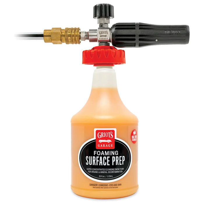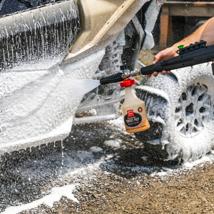 You'll love how Foaming Surface Prep delivers a deep clean, prevents wash-induced scratches, and sets the stage for surface decontamination, defect removal, and paint protection. Foaming Surface Prep has a high pH blend of detergents and other advanced active ingredients that delivers an intense cleaning action that softens road film and organic contaminants, and leaves the surface free of waxes and sealants. So you'll need to follow up by reapplying your wax or sealant basecoat. For tough, stuck-on dirt Foaming Surface Prep can be transformed into a powerful spray-on cleaner by diluting it in our Secondary Spray Bottle. At a 10:1 ratio, you can make quick work of grungy road slime, bird droppings, bug splats, and other stubborn stains.