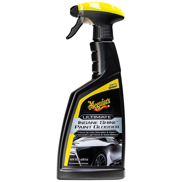 Meguiar's Ultimate Insane Shine Paint Glosser quickly amplifies your paint's gloss and color while also concealing light swirls! Polishing oils feed the paint for more depth, gloss, and shine. Additionally, the product fills in light swirls and other light defects, making them visibly disappear. By concealing paint defects, you will achieve increased gloss with a brilliant mirror-like finish! Use it after each wash to boost your finish or whenever you want an amazing show car shine!