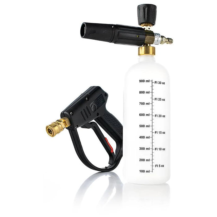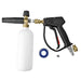 MTM Hydro's Snub Nose Foam Cannon Kit has the best of both worlds with the Original Foam Cannon paired with MTM Hydro's most popular gun, the M407. Whether you are foaming down your car on the weekend or you are a professional contract cleaner washing multiple vehicles per day, this tool will save you time and money. Simply attach the foam cannon to your pressure washer using one of the included fittings, fill with your desired ratio of chemical and you are up and running. The Snub Kit style of cleaning allows you to fit in tight spaces when cleaning and eliminates reaching 40" away to adjust your cannon settings.